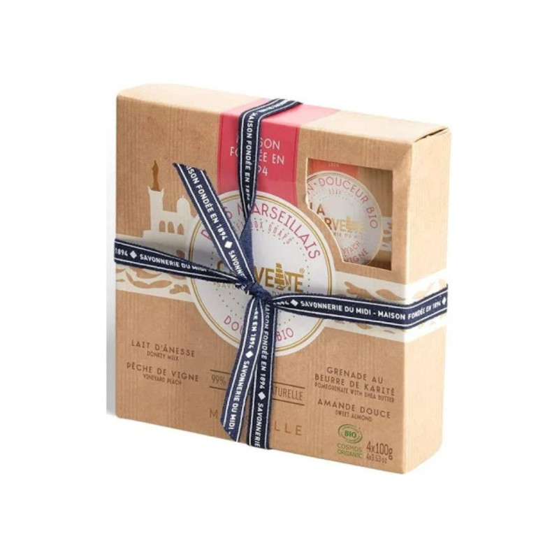 Descubra todo el saber hacer marsellés de La Corvette en nuestro cofre de regalo Pavés Marseillais Douceur Bio que incluye 4 jabones orgánicos certificados Cosmos Organic.