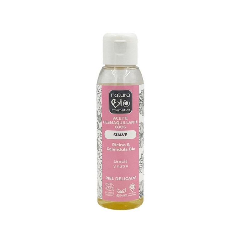 El Aceite Desmaquillante Ojos Suave Ricino y Caléndula Bio NaturaBIO Cosmetics elimina eficazmente el maquillaje, incluso el resistente al agua, mientras cuida tu piel. Formulado con ingredientes de cosmética natural certificada como el aceite de ricino, caléndula Bio y aloe vera Bio, limpia, nutre y deja una sensación de piel aterciopelada. Ideal para pieles sensibles, es vegano, sin alcohol, sin perfume y en envase 100% reciclado. Una opción perfecta si buscas cosmética saludable, cruelty free y respetuosa con el planeta.